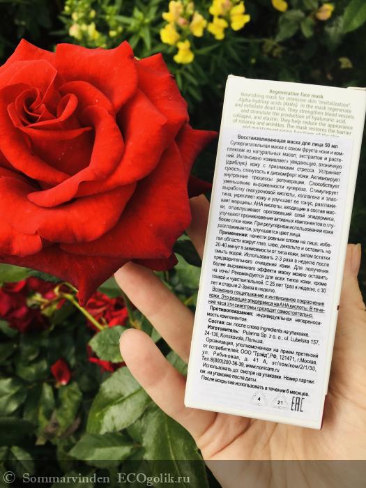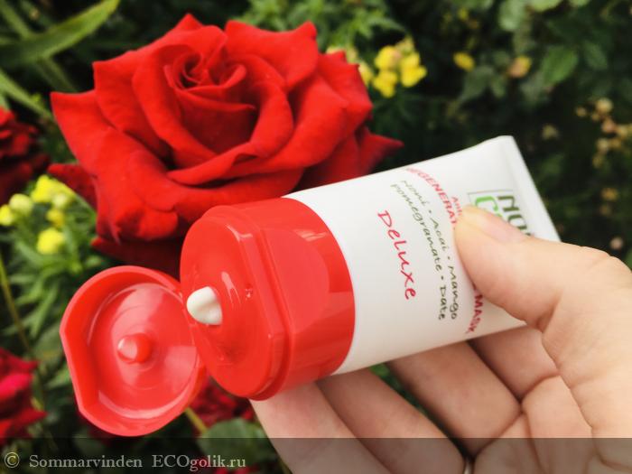 Маска на кокосовом масле, но опять же, повторюсь, у меня не вызвала проблем. А ещё тут есть ланолин и масло ши, которые тоже могли бы забить поры, но почему-то этого не произошло. В отличие от двух других масок тут есть экстракт финика, а гранат также считается антиэйдж-активом.