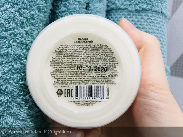 Если намазаться таким десертом на ночь, утром кожа напитанная и мягкая, так что по части увлажнения крем работает. Пощипывание после нанесения довольно продолжительное, однако не могу сказать, что чрезмерное или неприятное, в самый раз. Так как я наношу крем достаточно много, закончилась у меня баночка за неделю при ежедневном применении. Мне понравилась лёгкая консистенция, на тёплое время года самое то. Думаю, вместе со спортом и правильным питанием этот десерт поможет мне улучшить фигуру. По крайней мере кожа от него гладкая и приятная на ощупь, что уже радует.