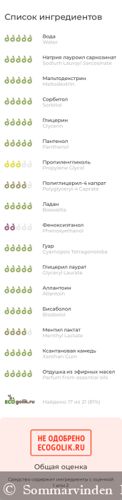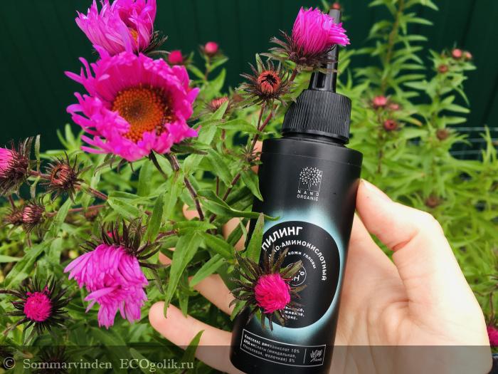 Действующим агентом служат кислоты: миндальная, гликолевая и молочная. Гликолевая вообще для меня довольно мощная, но тут она в сочетании с мягкими кислотами, а также успокаивающими компонентами — пантенолом, бисабололом, аллантоином, солодкой. Добавлены активы для волос (ладан, куркума). Также есть охлаждающий компонент — ментил лактат. В качестве консерванта здесь феноксиэтанол, но у меня с ним никаких проблем никогда не было, если кому актуально, обратите внимание.