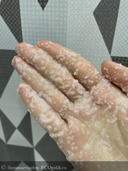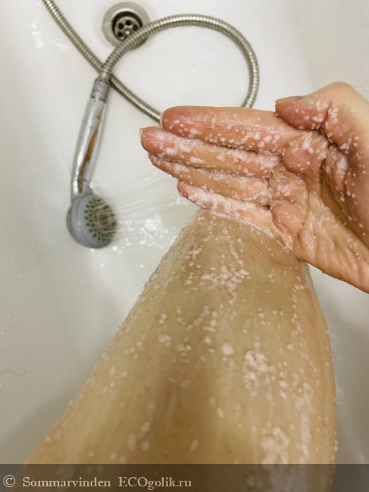 По мне скраб достаточно крупинистый, я предпочитаю более гладкую текстуру, похожую на варенье. Но плюс в этом тоже есть: крупные кристаллы соли не так быстро растворяются, я успеваю как следует помассировать все нужные зоны.
