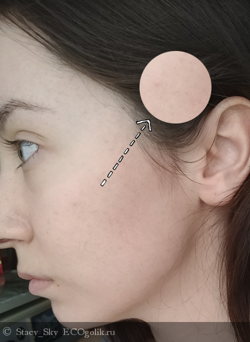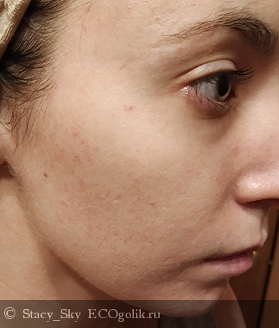 Если взять самый первый коллаж (до) и последнее фото фото (с утра без косметики), то можно наблюдать маленькие четыре пятна, которые прежде были довольно отчетливо выделяющимися прыщиками: