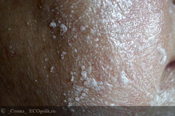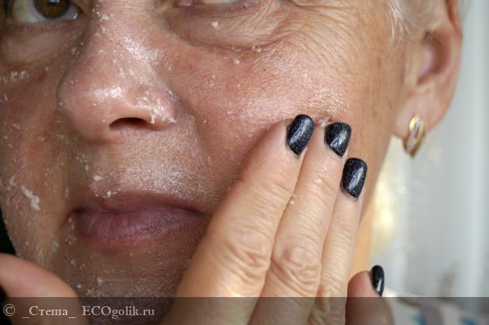 Смывается легко обычной тёплой водой, не оставляя после себя жирной плёночки. Ощущения очень комфортные, приятные. Я даже могу пропустить в этот день нанесения крема, потому что масла из состава дают увлажняющий и смягчающий эффект. Что для моей сухой кожи очень актуально. Причём несмотря на то, что скраб достаточно жёсткий, он прекрасно подошёл моей возрастной коже - скрабирует хорошо, НО не до красноты и царапин.