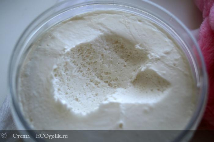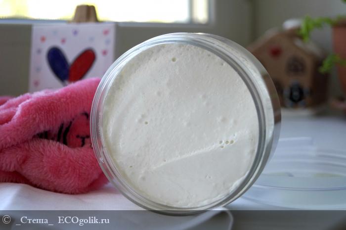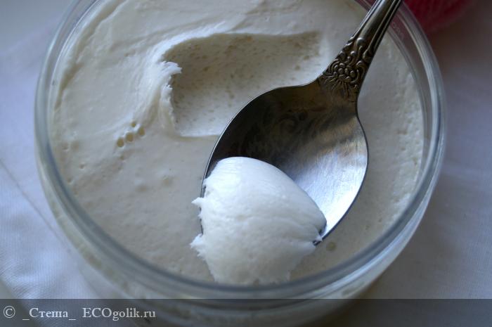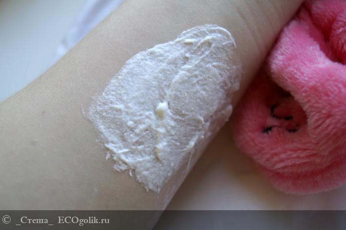 А текстура средства ещё более интересная, она немного похрустывающая, взбитая, как суфле. Густая и прекрасно сохраняет свою форму, если зачерпнуть маску из баночки, след останется до следующего использования. Да и если перевернуть баночку на бок или вверх ногами, маска не вытечет.