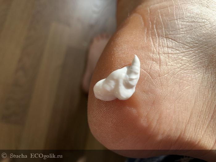 А все дело в его консистенции - это легкий крем на водной основе, могу сравнить его с арахисовым кремом для рук от другого бренда. В нем совсем нет жирности, он быстро впитывается и слабо питает и надо его добавлять еще, особенно, когда сухие пятки. Это плюс, что он не сильно жирный, но и минус, потому что результат есть, только в течение нескольких часов после нанесения.