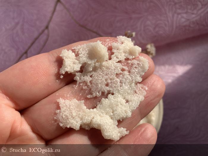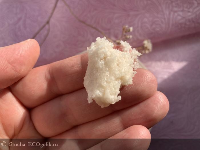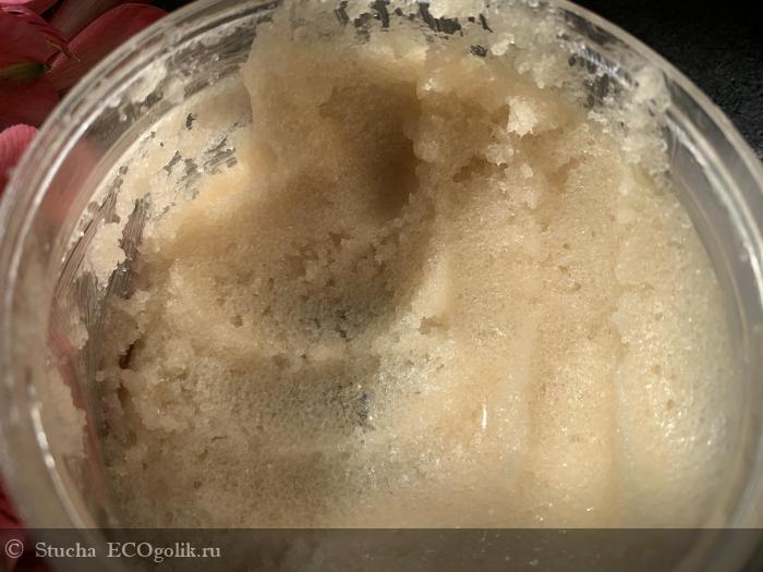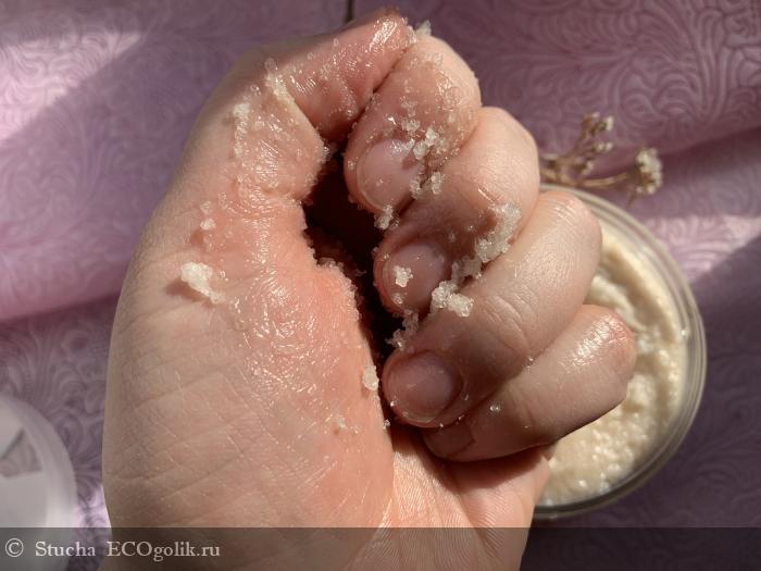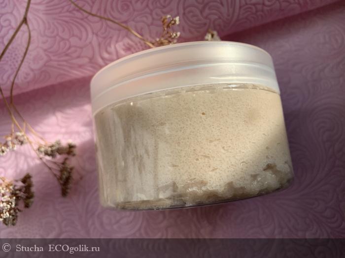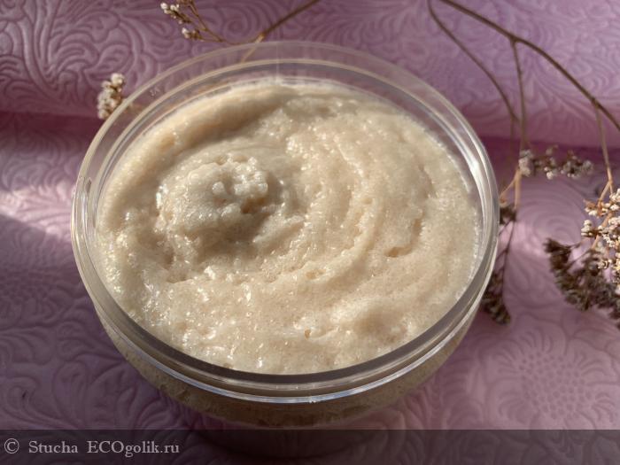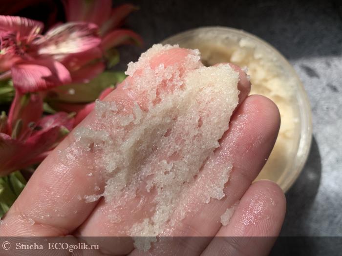Консистенция невероятно мягкая - запускать свои руки в этот конфитюр сплошное удовольствие)))). Я бы сравнивал его со сливочным десертом, очень нежный и воздушный скраб. Легко переносится на влажную кожу и дает приятное скрабирование. В меру жесткое, но для моей кожи заметное. Около 3-4 минут частички создают трение, а дальше тают.