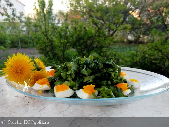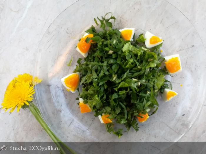 Вымочить листья в холодной воде 7-8 часов, воду можно менять. Затем покрошить всю зелень и вареные яйца, посолить, заправить кефиром или любым маслом.