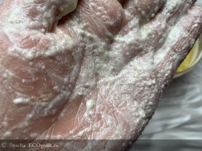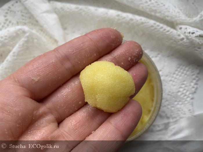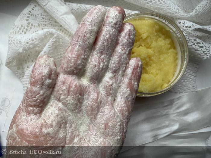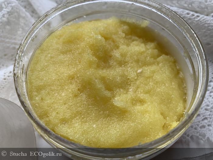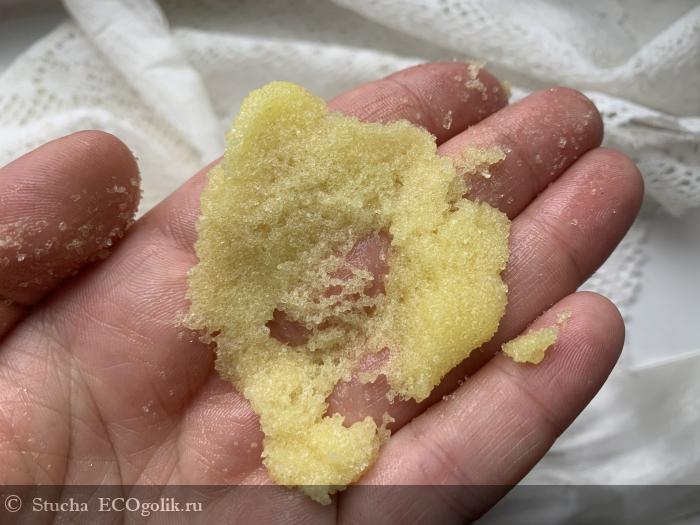 Скраб ближе к жестким, первые минуты я даже не могу делать надавливающие движения, жду, пока сахар немного растает. А вот потом настоящее наслаждение пройтись по всем участкам на теле и сделать хорошенький массаж этим средством! Сахар за счет масляных добавок и глицирина не дерет кожу. Скраб хорошо скользит и минут 5-7 у меня точно получается натирать кожу, пока сахар не растаял. Скраб подойдет, как профилактика целлюлита и для борьбы с плотной кожей на пяточках.