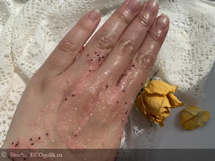 При этом на коже продукт прозрачный, не окрашивается. Еще видны мелкие зернышки мака, что делает продукт максимально реалистичным, а скрабирование еще более эффективным.