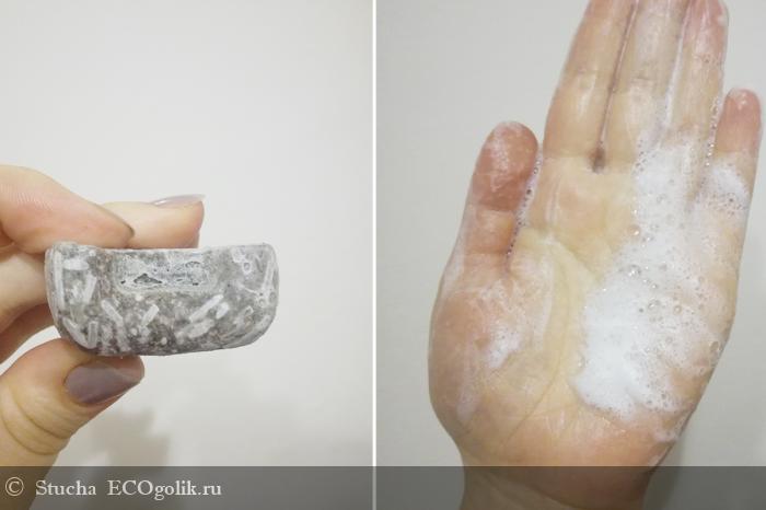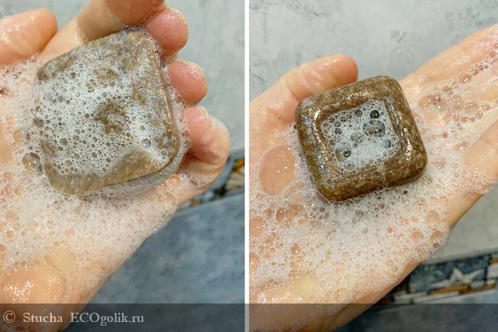 Размер шампуня небольшой, вес 50г, цена 370 рублей. Благодаря красивой выемке внутри и неоднородной поверхности снизу, он лучше отдает свою пену. Но если сравнивать с круглыми шайбами Шоколатте и Сиберина, то тут придется интенсивнее намыливать, чтобы получить пенну. Но явной "шапки" из нее не выходит.