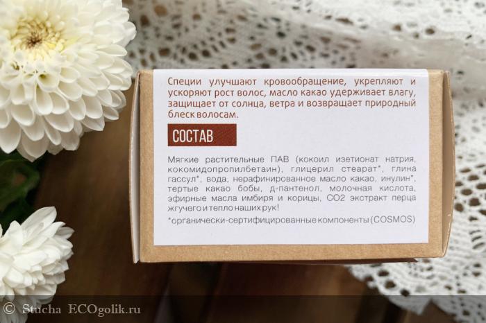 мягкие растительные ПАВ (кокоил изетионат натрия, кокомидопропилбетаин), глицерил стеарат*, глина гассул*, вода, нерафинированное масло какао, инулин*, тертые какао бобы, д-пантенол, молочная кислота, эфирные масла имбиря и корицы, СО2 экстракт перца жгучего и тепло наших рук! *