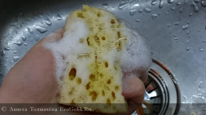 Пена хорошая, густая, хватает надолго. Я использую специальную губку с разнородной пористой структурой, такие специально сделаны для увеличения пенообразования. Одного нажатия на клапан хватает на раковину посуды.