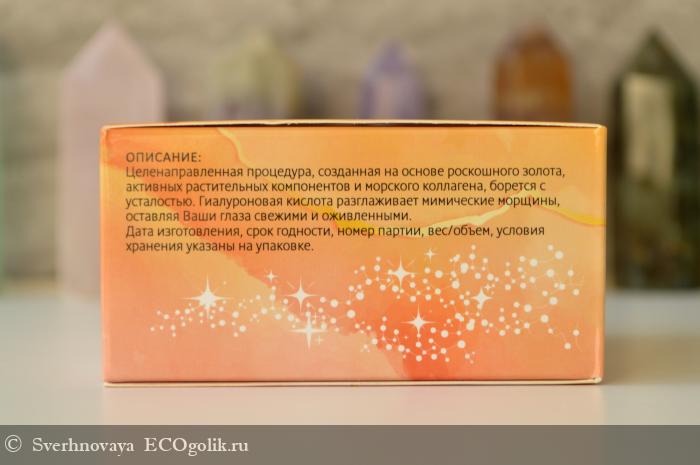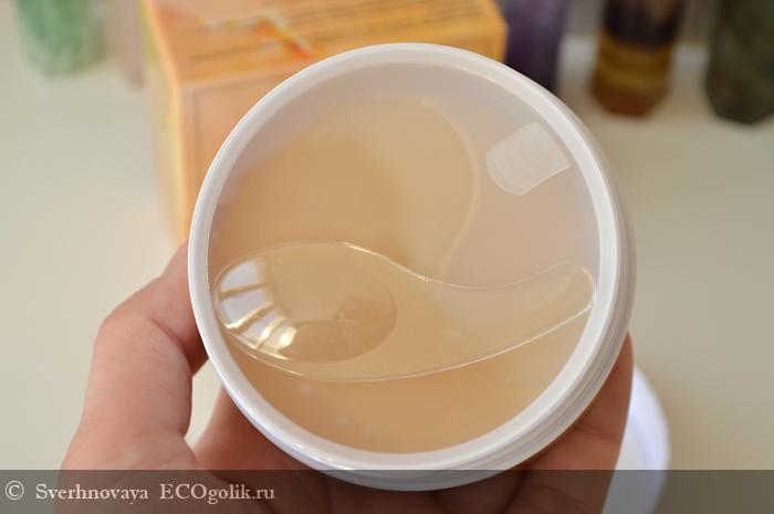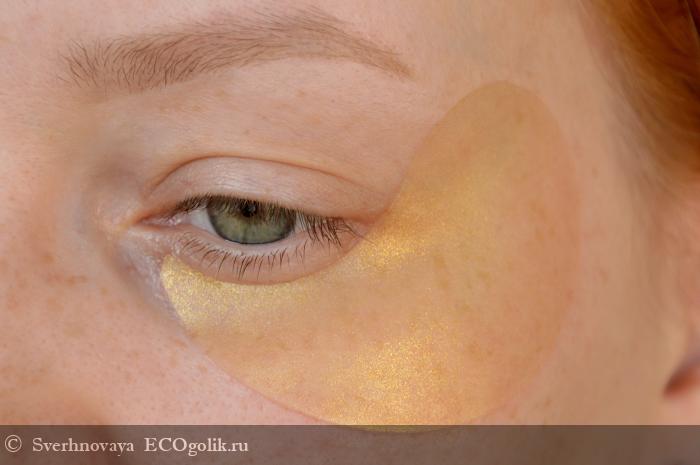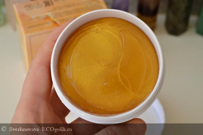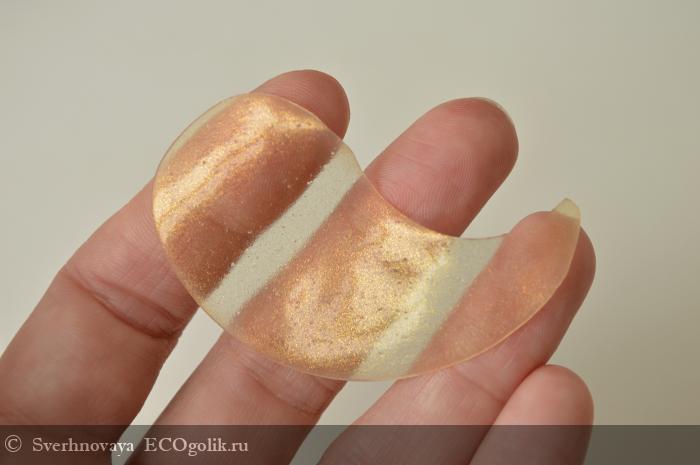 Патчи изготовлены из полупрозрачного гидрогеля с золотыми блёсточками. Выглядят красиво, приятно даже на себя в зеркало посмотреть во время процесса)) Материал тонкий, но плотный. Не рвётся, не деформируется.
