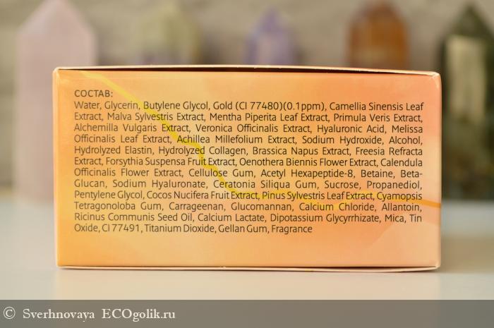 Основные ингредиенты: золото, гидролизированный коллаген, экстракт плодов огурца, розовая вода, сок дерева Кипарисовика туполистного, экстракт листьев Алоэ Барбаденсис, алантоин, экстракт корня Шлемника Байкальского, экстракт листьев зеленого чая, экстракт растения Хоттуния Кордата, экстракт полыни, экстракт фрукта Юзу, экстракт семян грейпфрута, экстракт стебля бамбука, экстракт листьев сосны болотной.