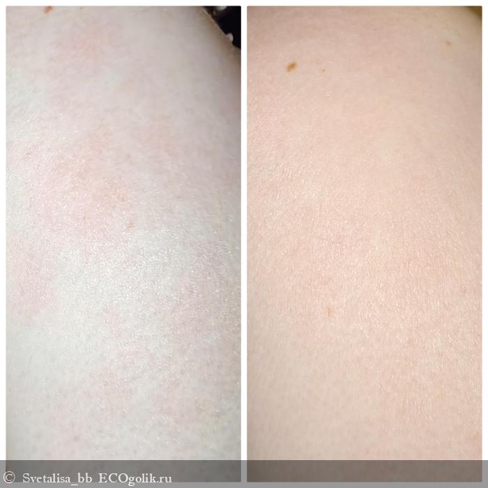 По ощущениям молочко это хорошо смягчает кожу и увлажняет, дарит чувство комфорта. А ещё успокаивает раздраженную кожу (шелушения, покраснения за ночь проходят). Вот пример (с вечера и утром):
