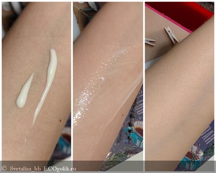 и довольно жидкое. По консистенции несколько маслянистое, но не жирное и не липкое. Распределяется легко, не полосит при нанесении. Впитывается довольно быстро, не тяжёлое.