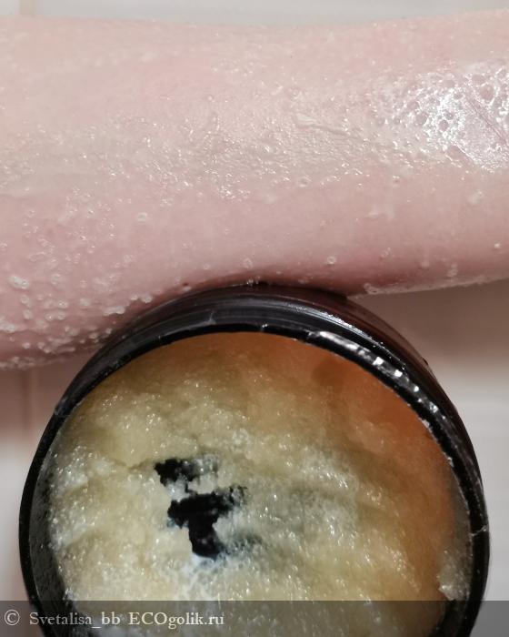 ✅ По скрабированию он скорее жёсткий. Очищает и отшелушивает как надо, сахар сразу не исчезает и не растворяется. Можно не торопиться при применении этого скраба.