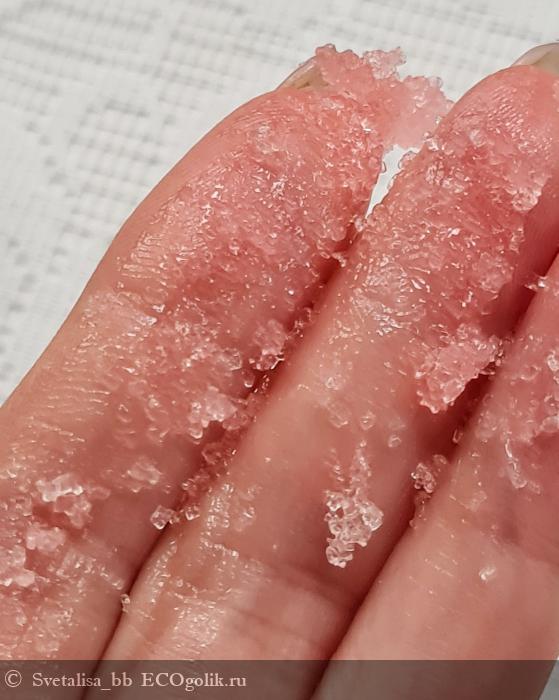 Сам скраб очаровательно розовый, с крупными частичками сахара. Сразу они не тают, потому есть время насладиться скрабированием.