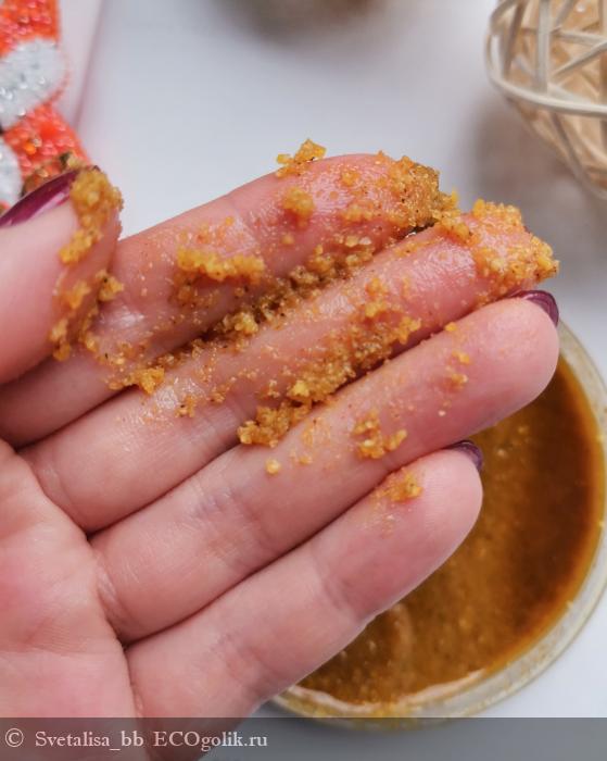 Скраб золотисто-оранжевый, насыщенный по цвету и ароматный. Сладковатый запах облепихового варенья с ноткой цитруса. Звучит очень приятно и вкусно.
