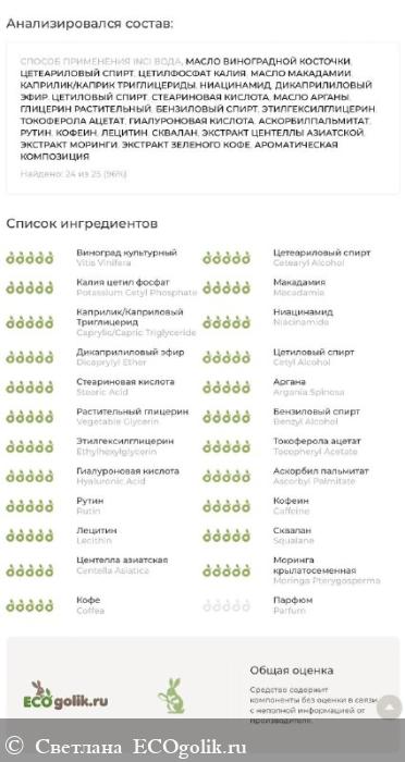 В состав входят активные компоненты такие как: Ниацинамид, Витамин С, Рутин, Кофеин и экстракты центеллы азиатской, моринги и другие. Состав полностью безопасен, подойдет любому типу кожи, в том числе и для чувствительной.