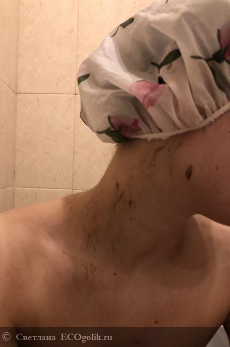 После нанесения как написано в инструкции, я воспользовалась шапочкой для душа. Естественно я одела шапочку на голову и стала ждать строго по времени, но маска начала течь и капать с головы прям сквозь шапочку.