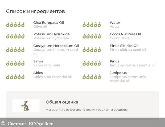 В состав входят активные компоненты такие как: Масло оливы и хлопка, масло кедровое, эфирное масло сосны и пихты. Состав полностью безопасен и натурален, подходит для всех типов кожи в том числе и для чувствительной.