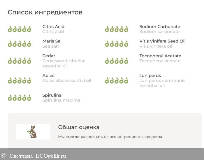 В состав входят активные компоненты такие как: Масло виноградной косточки, эфирное масло кедра, эфирное масло можжевельника, эфирное масло пихты, эфирное масло сосны и морская соль. Состав полностью безопасен, не вызывает аллергии и раздражения. Подходит для всех типов кожи, в том числе и для чувствительной.