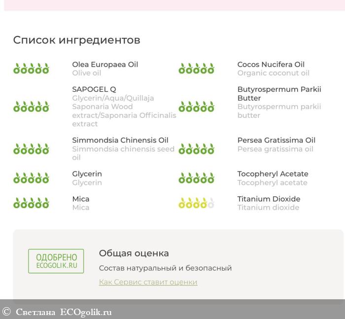 В состав входит активные компоненты такие как: Витамин Е, масло жожоба, масло кокоса и масло ши. Состав полностью натуральный и безопасный, подходит для всех типов кожи в том числе и для чувствительной.