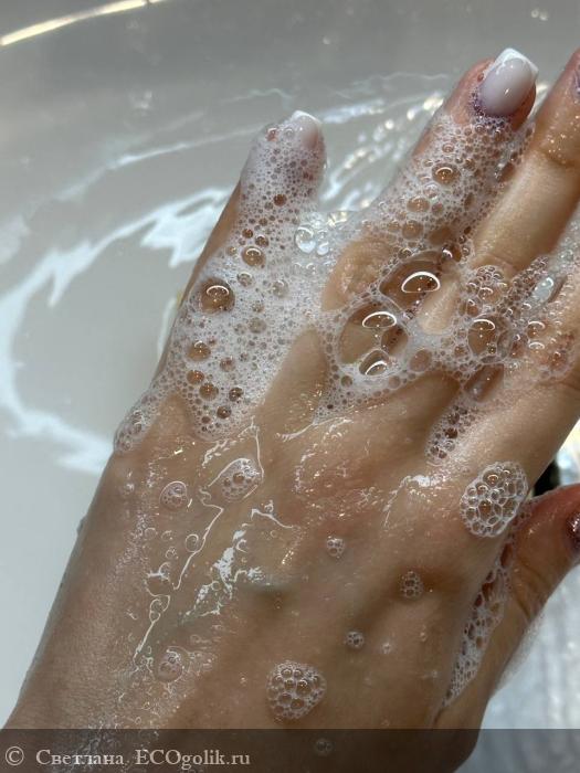 Хорошо пенится в белую пену. Прекрасно очищает кожу от неприятного запаха и загрязнений. Не стягивает и не сушит кожу рук. Подходит для ежедневного ухода.