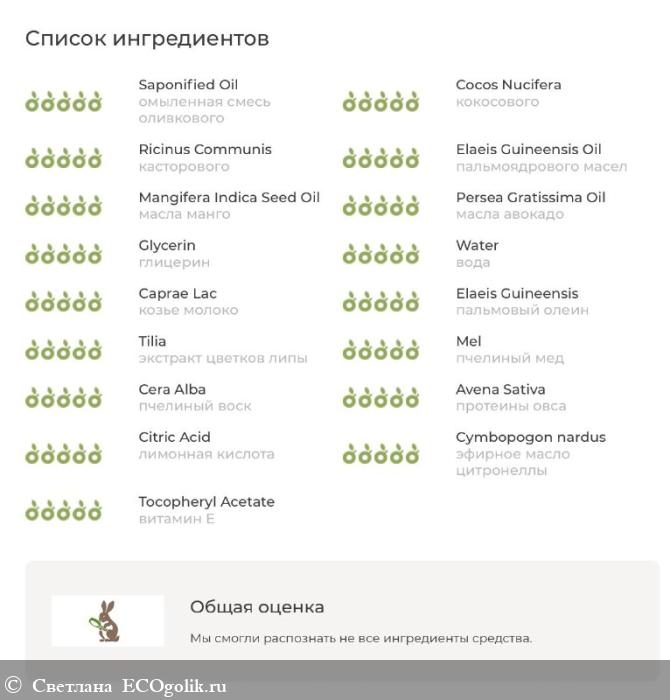 В состав входят активные компоненты такие как: Масла оливковое, кокосовое, касторовое. Пчелиный мед, протеины овса, витамин Е. Состав полностью безопасен и подойдет для взрослых и детей. Не вызывает аллергии и раздражения.