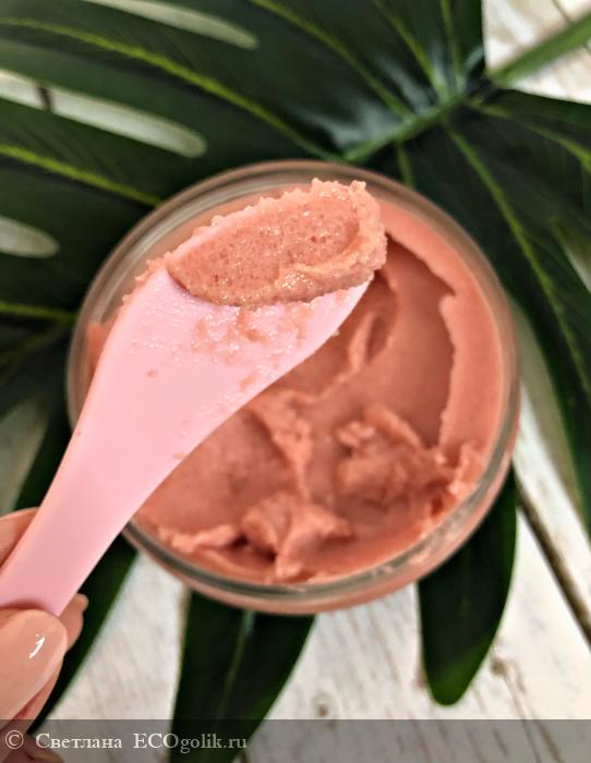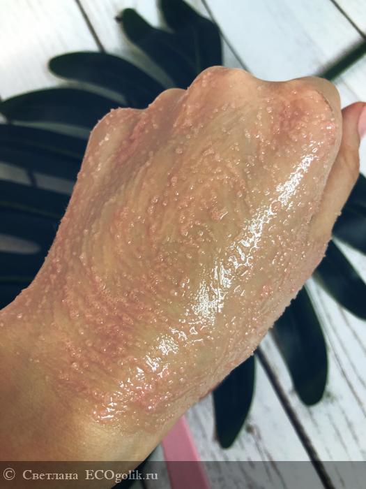 О текстуре: Скраб имеет мелкие очищающие частицы которые не царапают кожу. Обволакивает кожу, после скраба нет необходимости использовать крем, так как в составе очень много масел для увлажнения кожи.