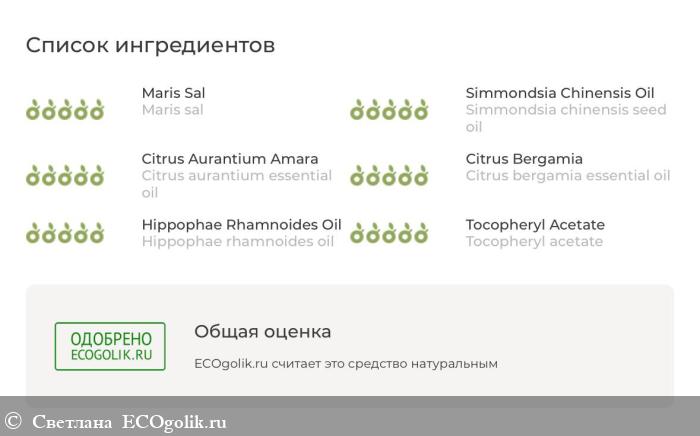 В состав входят активные компоненты такие как: Морская соль, масло жожоба, масло облепиховое, эфирное масло апельсина, эфирное масло бергамота. Состав полностью безопасен и натурален, и подходит для всех типов кожи, в том числе и для чувствительной.