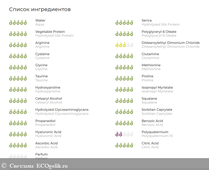 Состав хороший в нем нет силиконов и всякой там химии. Но к сожалению,сервис не смог полностью одобрить состав, так как нашел там пленкообразователь, который нужен для фиксации и используется как антистатик для волос