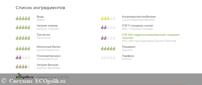 Aqua, cocamidopropyl betaine (мягкий пав из кокосового масла), sodium chloride, peg-7 glyceryl cocoate (мягкий пав из кокосового масла), panthenol, peg-200 hydrogenated glyceryl palmate, hydrolyzed milk protein (гидролизат молока), hydrolyzed keratin гидролизированный кератин) urtica dioica leaf extract (экстракт крапивы), glycerin, polyquaternium-7, натуральный ароматизатор, sodium benzoate (натуральный консервант)