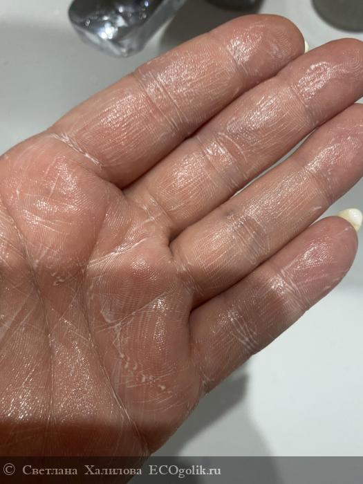 Смачиваем руку водой и наносим гель для умывания. Легкими масирующими движениями начинаем смывать. Видно что некоторые средства смылись практически сразу, даже без усилий .Чтоб смыть остальные косметические продукты ,мне пришлось дважды нанести гель и приложить усилия.