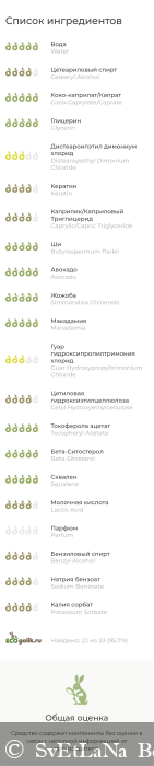 Aqua (Вода), Cetearyl Alcohol (Цетеариловый спирт / эмульгатор), Coco-Caprylate (Коко каприлат / эмолент) , Glycerin (Глицерин), Distearoylethyl Dimonium Chloride (Дистеароилэтил димониум хлорид / кондиционер), Keratin (Кератин), Caprylic/Capric Triglyceride (Каприлик/каприк триглицериды / эмолент), Butyrospermum Parkii Butter (Масло ши), Persea Gratissima Oil (Масло авокадо), Simmondsia Chinensis Seed Oil (Масло жожоба), Macadamia Ternifolia Seed Oil (Масло макадамии), Guar Hydroxypropyltrimonium Chloride (Гуар гидроксипропилтримония хлорид / кондиционер), Cetyl Hydroxyethylcellulose (Цетил гидроксиэтилцеллюлоза / целлюлозный загуститель), Tocopherol, Beta-Sitosterol, Squalene (Токоферол, Бета-ситостерол, Сквален / природный антиоксидант), Lactic Acid (Молочная кислота), Parfum (Отдушка), Benzyl Alcohol, Sodium Benzoate, Potassium Sorbate (Бензиловый спирт, Бензоат натрия, Сорбат калия