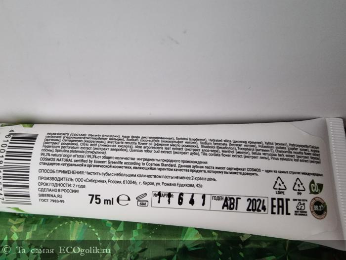 Паста в красивой яркой удобной упаковке. Беру ее не в первый раз. Вообще нравятся пасты Сиберины, в основном использую в гигиене зубов продукцию именно этой компании.