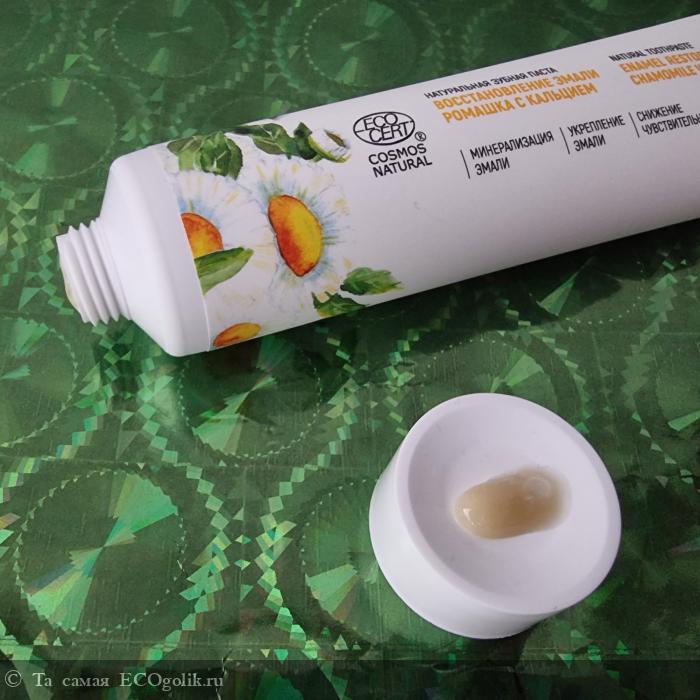Зубная паста Восстановление эмали "Ромашка с кальцием" имеет в своем составе даже спирулину, а это дополнительная оздоравливающая функция пасты для полости рта.