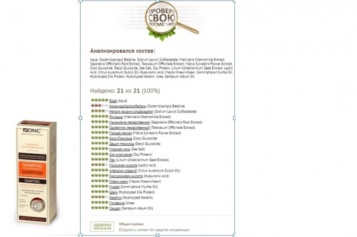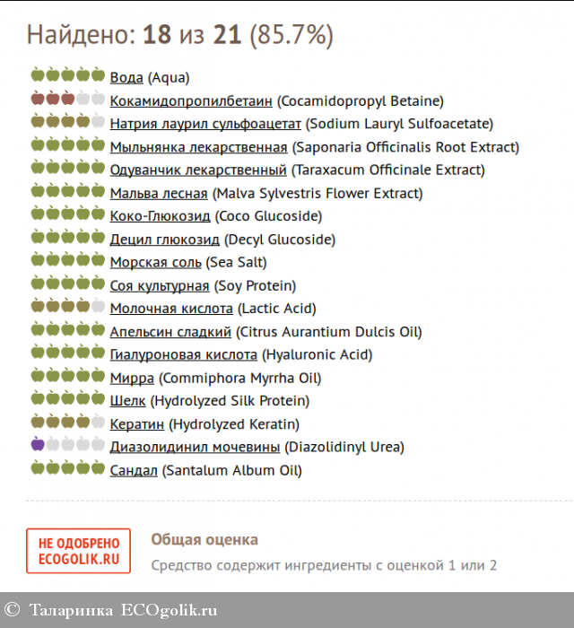 Что ж, из 21 ингредиента сервис распознал 18, при чем единственный из них, а именно Диазолидинил мочевины, получил всего одно яблочко невкусного цвета. Такая характеристика означает, что продукт уже не может рассматриваться как полностью натуральный. Ведь данный ингредиент является синтетическим консервантом и может вызвать дерматит, являясь токсичным. Хорошо, что он хотя бы стоит на предпоследнем месте в списке, что означает минимальное его количество в данном продукте. Жаль, конечно, что DNC все же не смог обеспечить нам натуральность шампуня, однако в составе большее количество занимают натуральные очищающие компоненты и мягкие ПАВы.
