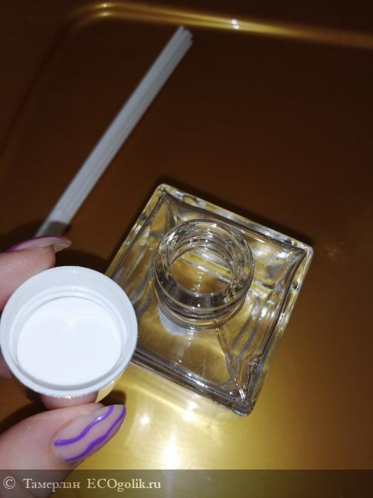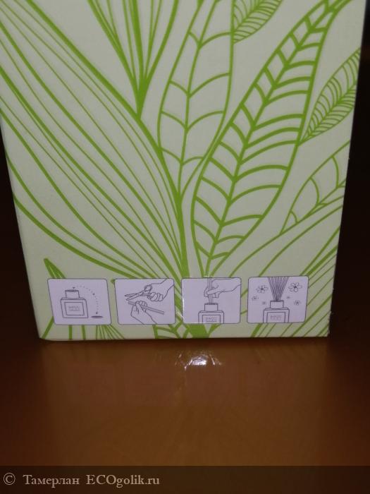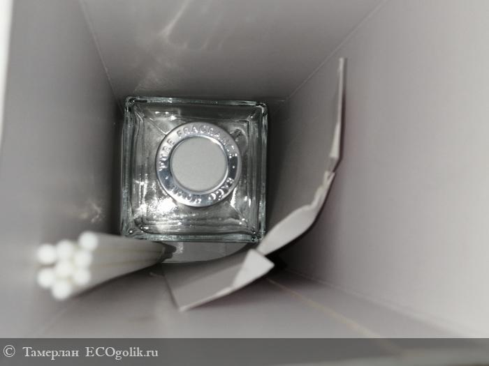 открыв упаковку мы обнаруживаем внутри стеклянный флакон и набор фетровых палочек, при помощи которых аромат распространяется по помещению
