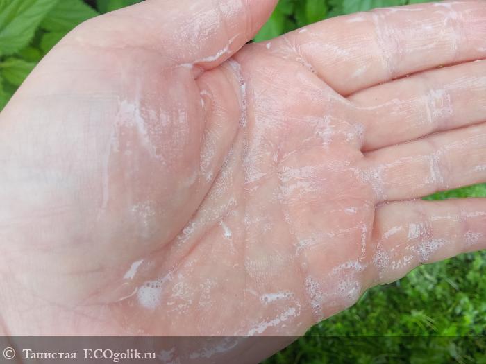 Вступая в контакт с водой, показывает себя во всей красе, образуя воздушную и пышную пену, которую приятно наносить на лицо и шею.