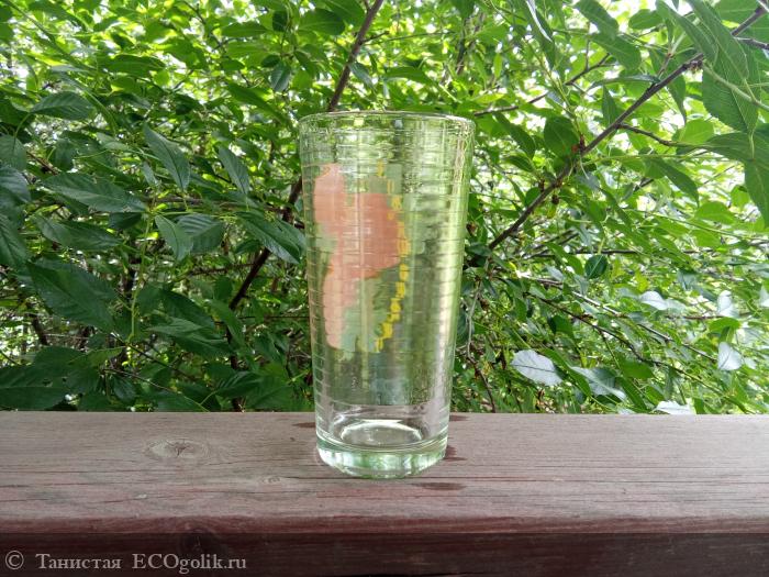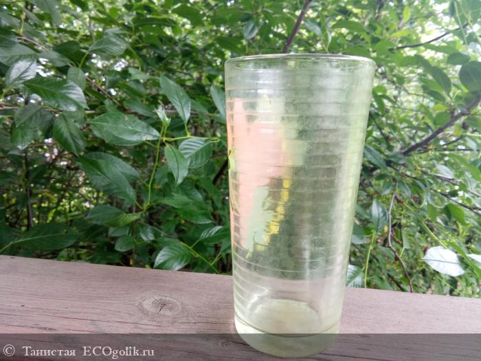 Вот этот стакан я обнаружила в беседке после посиделок дочери с подругами. Вообще-то, дочь вымыла за собой всю посуду, а стакан, похоже, просто не заметила (он стоял в укромном уголке). Несколько дней он пробыл в беседке и стал похож на переживший апокалипсис предмет. Остатки сока прилипли к дну и стенкам, выглядит всё это так себе…