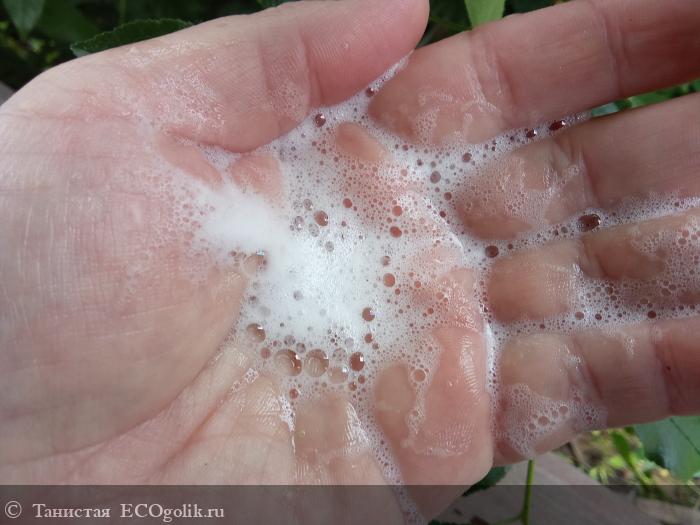 Его нет. Вообще, ни малейшего намёка на аромат. То, что мне нужно! Гель прозрачный и бесцветный, как и положено такому средству, с гелеобразной текстурой, при контакте с водой быстро и хорошо мылится.