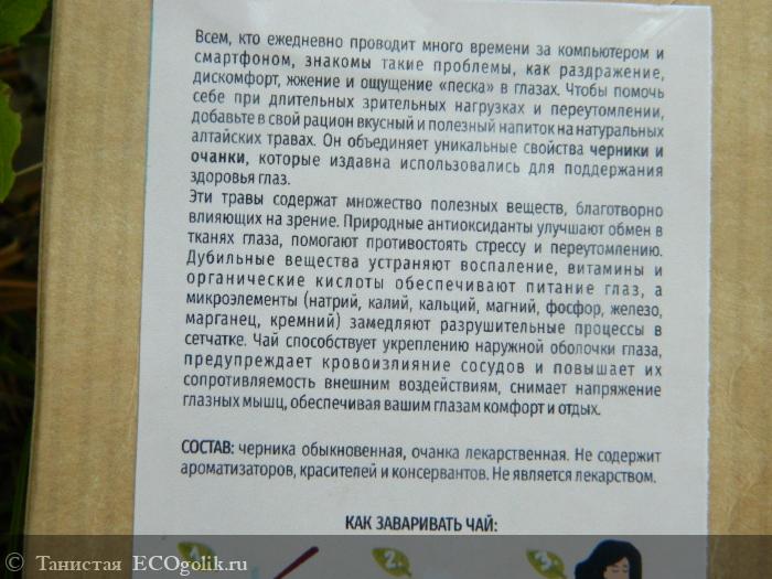 Производитель не указывает, сколько раз в день можно принимать чай. У меня получается один – после рабочего дня, вечером. И этого кажется достаточно: в глазах чувствуется расслабление, усталость проходит. Конечно, это не значит, что глаза можно нагружать по новой, им в любом случае необходим отдых. Например, посидеть ещё за одной чашечкой чая или посмотреть в окно, помечать о приятных вещах, сделать маску для лица, принять ванну – простор фантазии не ограничен.