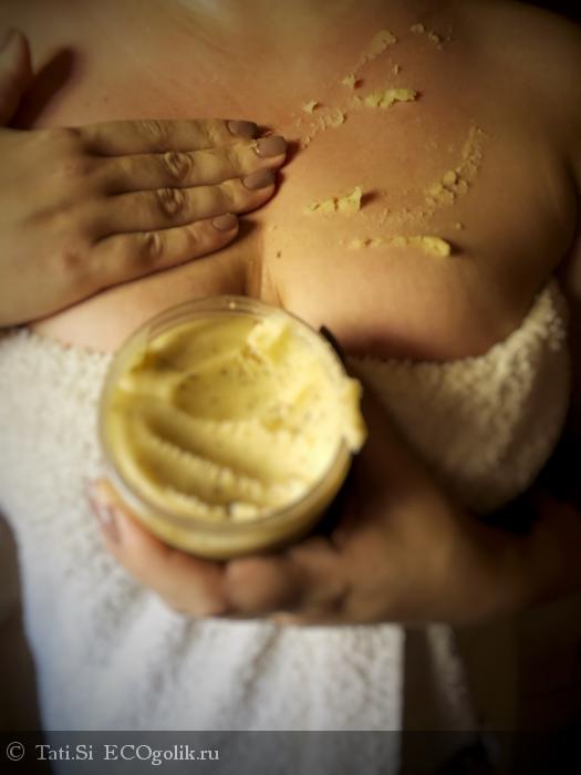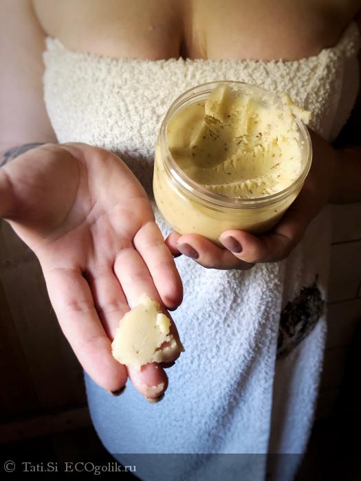 При нанесении на тело сначала за счет плотной текстуры идет активное скрабирование, а потом мягкий медово-солевой массаж до полного растворения крупинок соли. Ощущения при нанесении в парной просто невероятные.