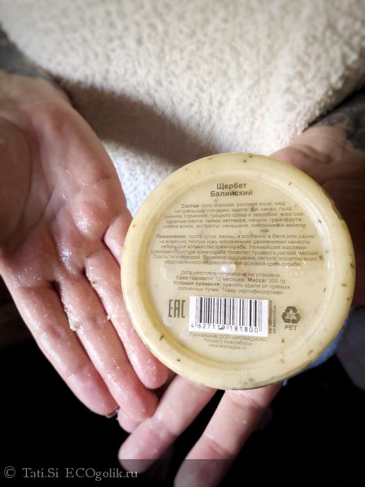 Образовал легкую, скользящую медово-масленную пленку на теле с вкраплениями аниса и частицами соли. Их, кстати, в скрабе не мало, что видно уже даже при покупке средства в магазине.