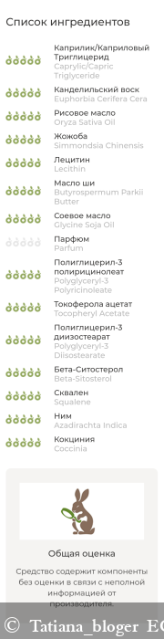 Натуральные компоненты, подходящие даже чувствительной коже: растительные воски и загустители, масла рисовых отрубей, жожоба и ши. Отсутствие искусственных красителей и отдушек. Среди активов: лецитин, фитостеролы, сквален (не сквалан!), комплекс натуральных токоферолов.