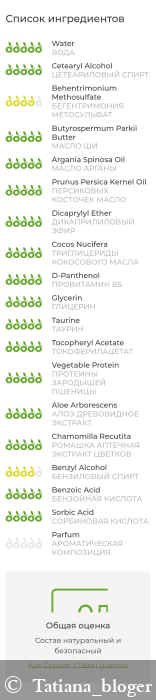 ВОДА, ЦЕТЕАРИЛОВЫЙ СПИРТ, БЕГЕНТРИМОНИЯ МЕТОСУЛЬФАТ, МАСЛО ШИ (КАРИТЕ), МАСЛО АРГАНЫ, ПЕРСИКОВЫХ КОСТОЧЕК МАСЛО, ДИКАПРИЛИЛОВЫЙ ЭФИР, ТРИГЛИЦЕРИДЫ КОКОСОВОГО МАСЛА, ПРОВИТАМИН В5 (Д-ПАНТЕНОЛ), ГЛИЦЕРИН, ТАУРИН, ТОКОФЕРИЛАЦЕТАТ, ПРОТЕИН ЗАРОДЫШЕЙ ПШЕНИЦЫ, АЛОЭ ДРЕВОВИДНОЕ ЭКСТРАКТ, РОМАШКА АПТЕЧНАЯ ЭКСТРАКТ ЦВЕТКОВ, БЕНЗИЛОВЫЙ СПИРТ, БЕНЗОЙНАЯ КИСЛОТА, СОРБИНОВАЯ КИСЛОТА, АРОМАТИЧЕСКАЯ КОМПОЗИЦИЯ