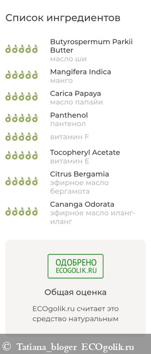 масло ши (карите), баттер манго, масло папайи, пантенол, витамин F, витамин E, эфирное масло бергамота, эфирное масло иланг-иланг.