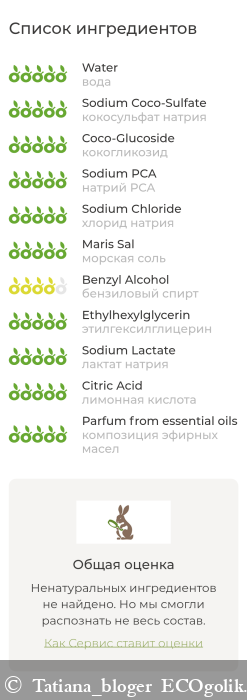 вода, кокамдопропилбетаин, кокосульфат натрия, кокогликозид, натрий РСА, гидролат тархуна, хлорид натрия, морская соль, бензиловый спирт, этилгексилглицерин, лактат натрия, лимонная кислота, композиция эфирных масел.