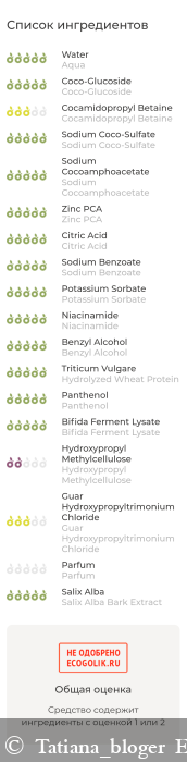 Aqua (вода), Coco-Glucoside (мягкий ПАВ), Cocamidopropyl Betaine (мягкий ПАВ), Sodium Coco-Sulfate (мягкий ПАВ), Sodium Cocoamphoacetate (мягкий ПАВ), Zinc PCA (цинк PCA), Citric Acid (лимонная кислота), Sodium Benzoate (бензоат натрия), Potassium Sorbate (сорбат калия), Niacinamide (ниацинамид), Benzyl Alcohol (бензиловый спирт), Hydrolyzed Wheat Protein (гидролизованные протеины пшеницы), Panthenol (Д-пантенол), Propionibacterium Ferment Lysate (лизат пропионовокислых бактерий), Bifida Ferment Lysate (лизат бифидобактерий), Hydroxypropyl Methylcellulose (загуститель), Guar Hydroxypropyltrimonium Chloride (кондиционирующая добавка), Parfum (отдушка), Salix Alba Bark Extract (экстракт коры белой ивы).